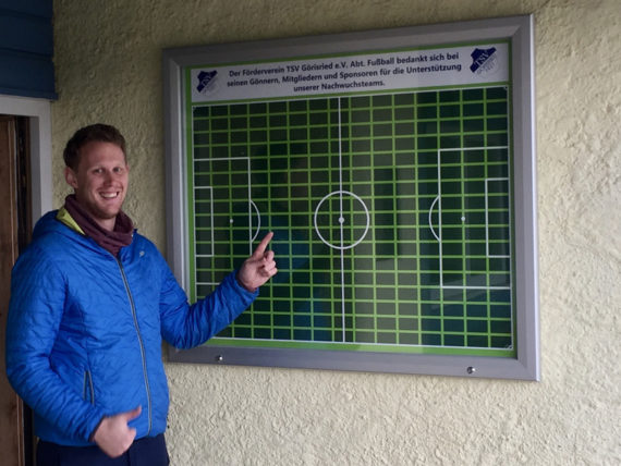 Sponsorentafel im Design Fussballfeld: Die Sponsorentafel ist angekommen! Vielen Dank für die zuverlässige Abwicklung. Die Tafel entspricht vollständig unseren Vorstellungen und macht hinsichtlich Qualität, Funktionalität und Design einen perfekten Eindruck. Sie wird uns helfen, noch aktiver in der Jugendförderung unseres Vereines tätig zu sein. Besten Dank. JOSEF GUGGEMOS